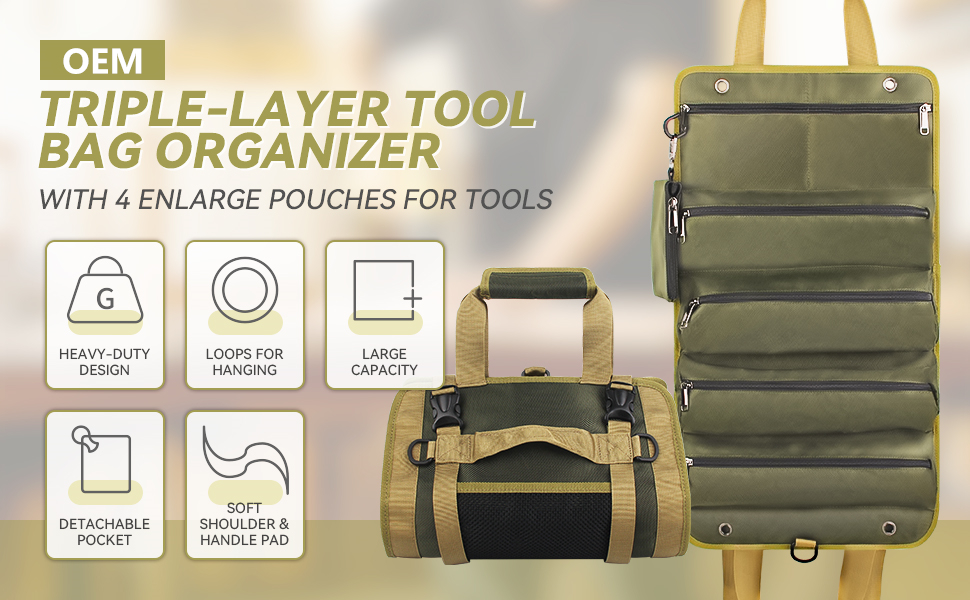 The roll organizer has 4 enlarged pouches for tools & 2 zipper pockets for small items on the front side. The reverse sides are designed for the wrench and flat & light tools. The detachable bag carries smaller Items like drill bits, screws & spare parts, which can hang to the d-loops.