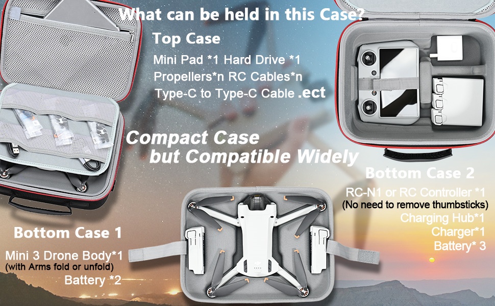 - ✈Compact & Flexible Design -- The bottom uses the upper & lower floor sctructure, which greatly save the space. The upper floor can hold the drone body and 2pcs batteries, while the lower layer holds the RC controller or stock controller, charging hub with 3 batteries & charger. Besides, there are the adhesive strap on the top and bottom that would secure the drone body and controller.