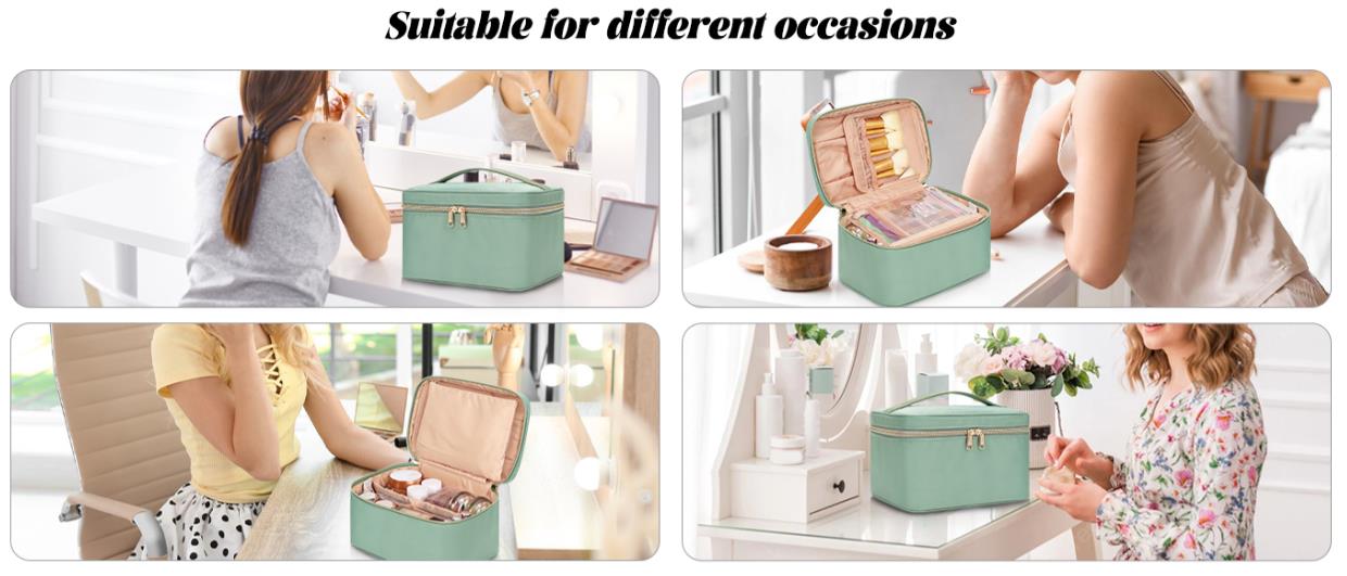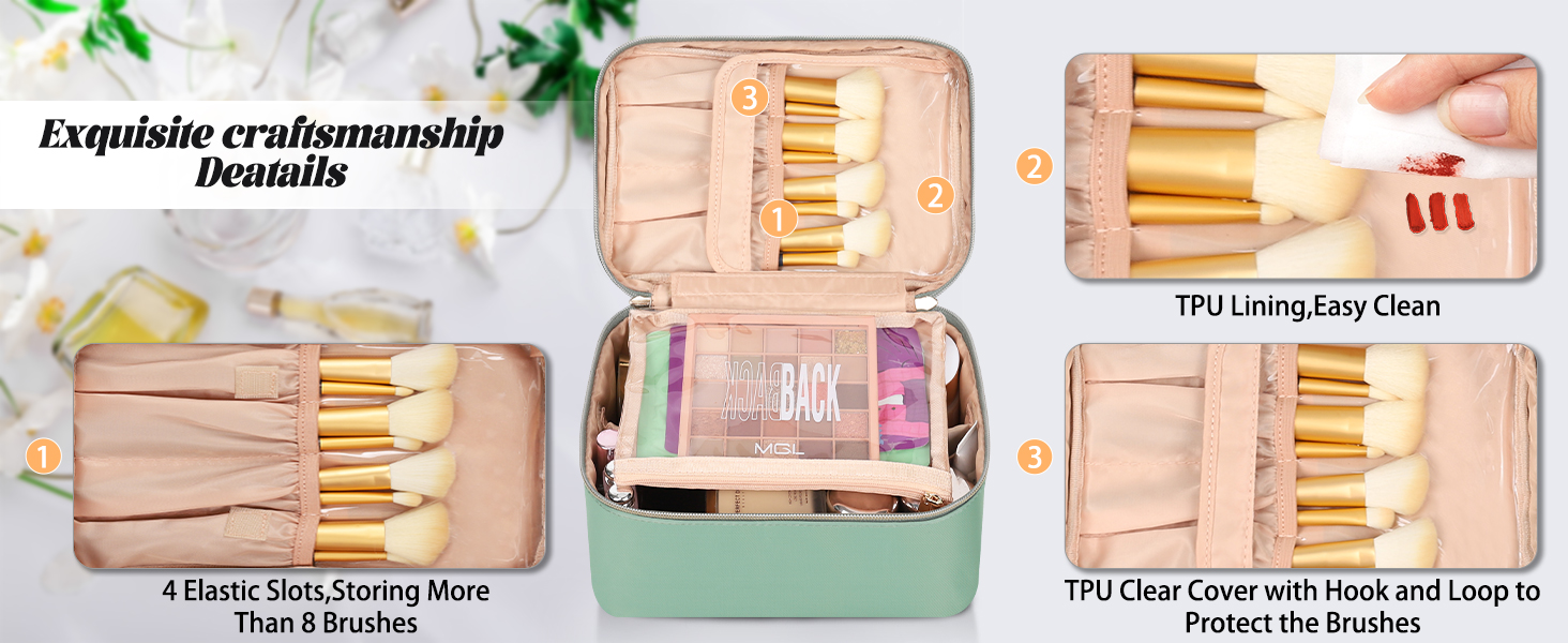 1. Multifunctional Makeup Bag:This makeup bag has a special brush storage area with TPU clear cover structure,very great for protective makeup brush to prevent damage. There are four makeup brush slots on the upper layer that offer you to carry daily makeup brushes.