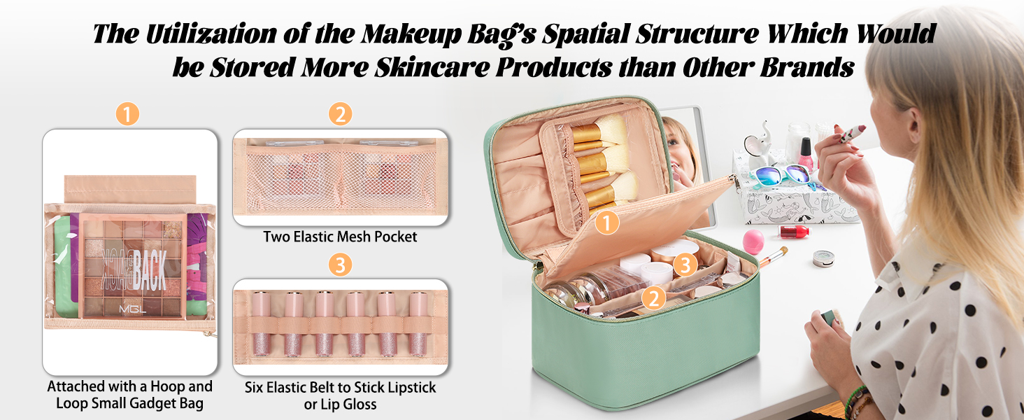 3. Special Divider with Elastic Sections:The makeup bag's divider have two sides,one side has two mesh pockets,the other side has six slots to store lipsticks.The utilization of the makeup bag's spatial structure,which would be stored more skincare/cosmetics products than other brands.