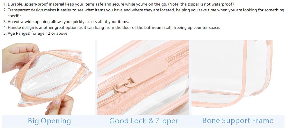 - Gennemsigtige og forstærkede sømme: Den TSA-godkendte toilettaske er lavet af 0,5 mm tyk transparent PVC, hvilket gør det nemmere at få øje på dine ejendele og sikrer, at sikkerhedspersonalet hurtigt tjekker dem. Forstærkede sømme forhindrer, at tasken let revner, hvilket effektivt reducerer væskelækage fra tasken (lynlåsen er ikke vandtæt).