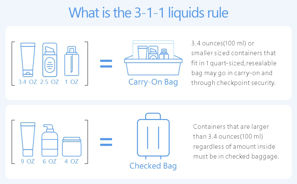 - Den gennemsigtige rejsetoilettaske på 18,5 x 13,5 x 6,3 cm følger nøje TSA 3-1-1-reglerne for væsker til håndbagage fra alle flyselskaber, så du nemt og hurtigt kan komme igennem sikkerhedskontrollen med den i lufthavnen.