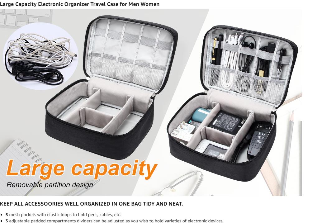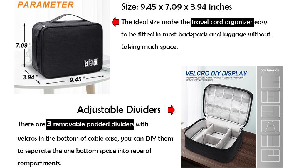 - 【DIY COMPARTMENT】- - There are three removable padded dividers with velcro in the bottom of cable case, you can DIY them to separate the one bottom space into several compartments, fitting accessories of different sizes, keeping all your electronic accessories in order.