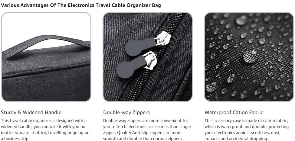 - 【PREMIUM QUALITY】 - - This travel cable organizer is made of waterproof cation 300D fabric and thick padded inner material. Newly improved double zippers with plane design are more smooth and durable. Superior & neat stitching makes the electronic organizer case exquisite and unique.