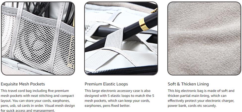 - 【NO MORE MESSY】 - - The cord travel case has compact pockets to keep everything organized well. Except 3 detachable dividers, there are 5 mesh pockets with elastic loops for slender cables, earphones, pens etc, prevent cables from getting enttangled.