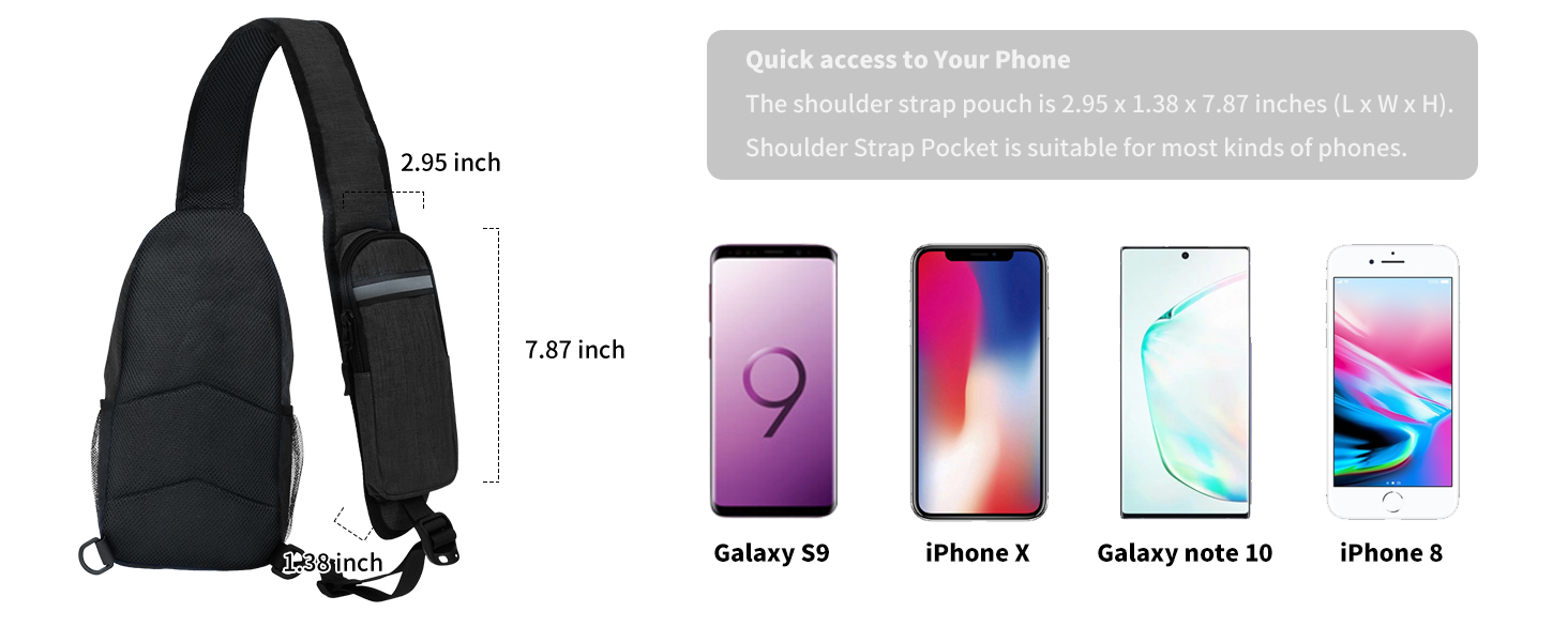 ★ Adjustable Reversible Shoulder Strap: Designed with 3 D-rings on the lower part, the adjustable shoulder strap can be connected with the left or right D-ring for your preference, so that it is convenient to wear on your left or right shoulder. The shoulder strap pouch is 3.5 x 1.5 x 7.5 inches (L x W x H), it hold the phone screen size under 7 inches easily. Shoulder strap can be adjusted from 31 ” to 39.5 ”.