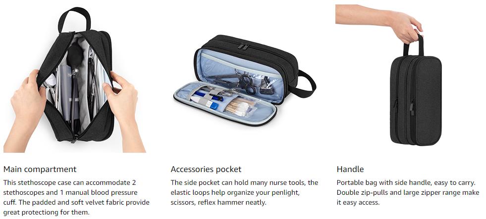 GREAT PROTECTION: The main compartment consists of soft velvet fabric and thickened padded lining, which can effectively absorb impacts and reduce damages caused by bumps and drops, securely keep your two stethoscopes or BP cuffs.