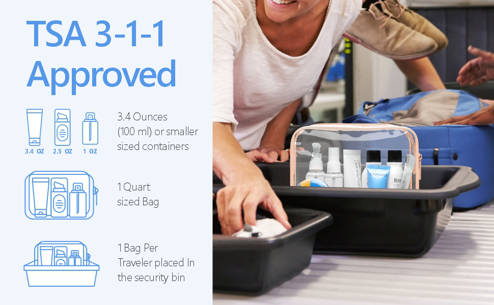 ★TSA мақұлданды- 7,5 x 5,9 x 2,2 дюймдік мөлдір дәретхана сөмкесі барлық авиакомпаниялардың қол сөмкесі үшін TSA 3-1-1 сұйықтықтар ережесін қатаң сақтайды, осылайша сіз онымен әуежайда қауіпсіздік скринингінен оңай және жылдам өте аласыз.