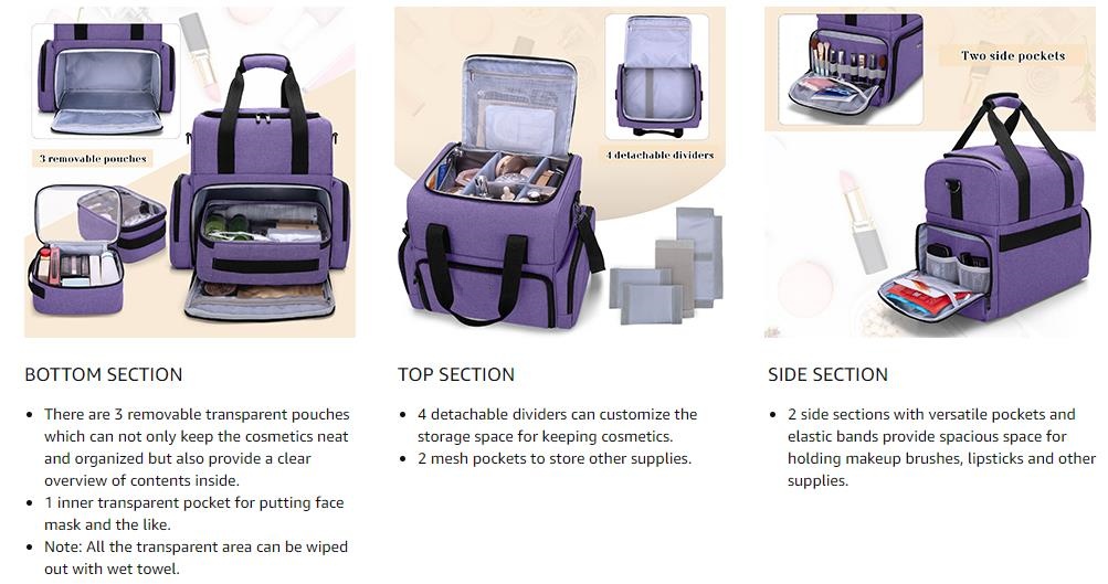 상단 수납 공간 – 분리 가능한 칸막이 4개로 화장품을 보관할 수 있는 수납 공간을 맞춤 설정할 수 있습니다. 다른 용품을 보관할 수 있는 메시 포켓 2개.