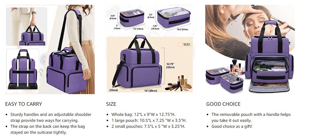 휴대가 간편합니다. 튼튼한 손잡이와 조절 가능한 숄더 스트랩으로 두 가지 방식으로 휴대할 수 있습니다. 뒷면의 스트랩으로 가방을 캐리어에 단단히 고정할 수 있습니다. 가방 전체 크기: 12인치(가로) x 9인치(세로) x 12.75인치(높이) / 큰 파우치 1개: 10.5인치(가로) x 7.25인치(세로) x 3.5인치(높이) / 작은 파우치 2개: 7.5인치(가로) x 5인치(세로) x 3.25인치(높이)