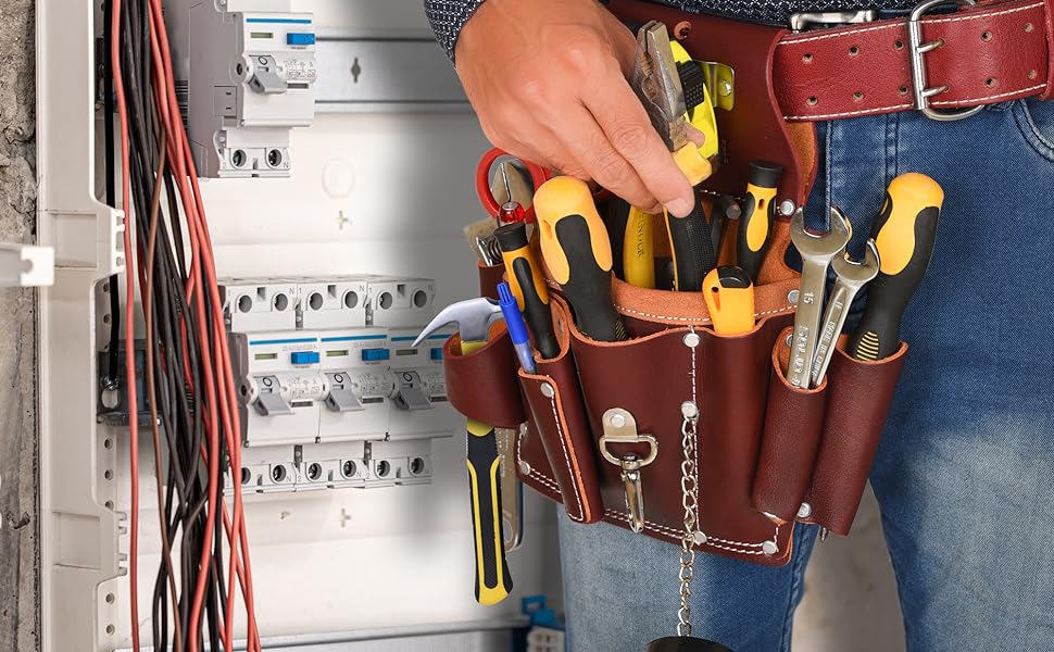 - 전기 기술자용 가죽 파우치는 모든 종류의 공구를 보관할 수 있는 여러 개의 포켓이 있습니다. 전기 테이프용 "T" 체인(금속) 테이프 클립이 특징입니다. 터널 루프는 최대 3.6인치(약 9.6cm) 폭의 작업용 벨트를 수용합니다. 녹슬지 않는 리벳으로 보강되어 내구성이 뛰어납니다.