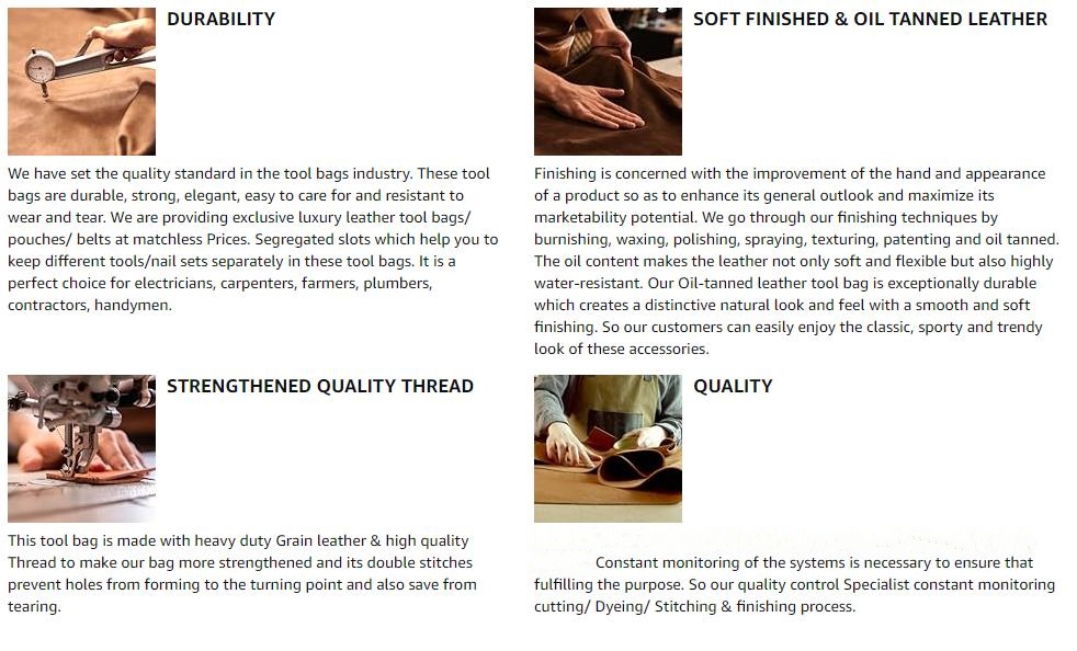 - 이 전기공 도구 파우치는 3.50mm 두께의 프리미엄 100% 천연 그레인 가죽으로 제작되었습니다. 편리하고, 기능적이며, 편안하고, 내구성이 뛰어나며, 오래 사용할 수 있습니다.