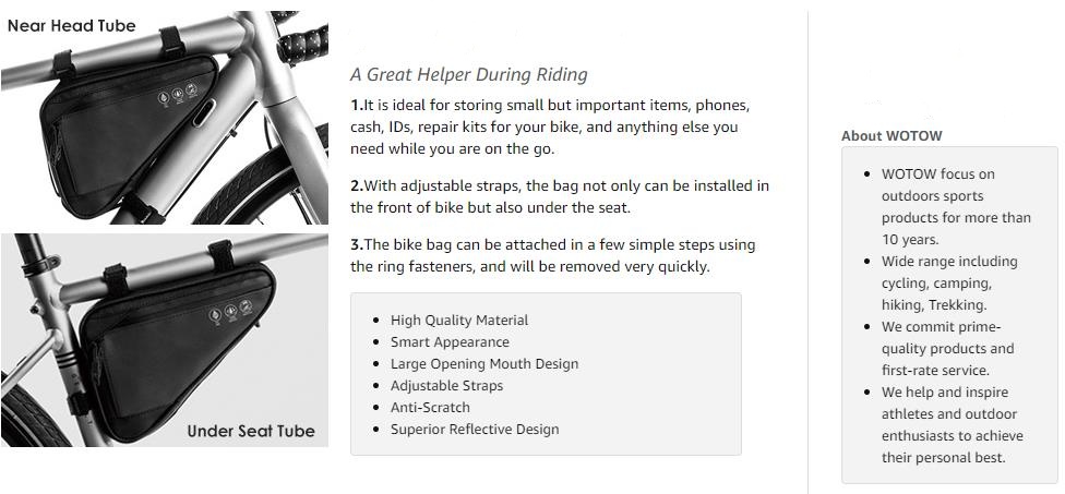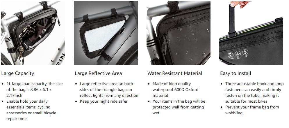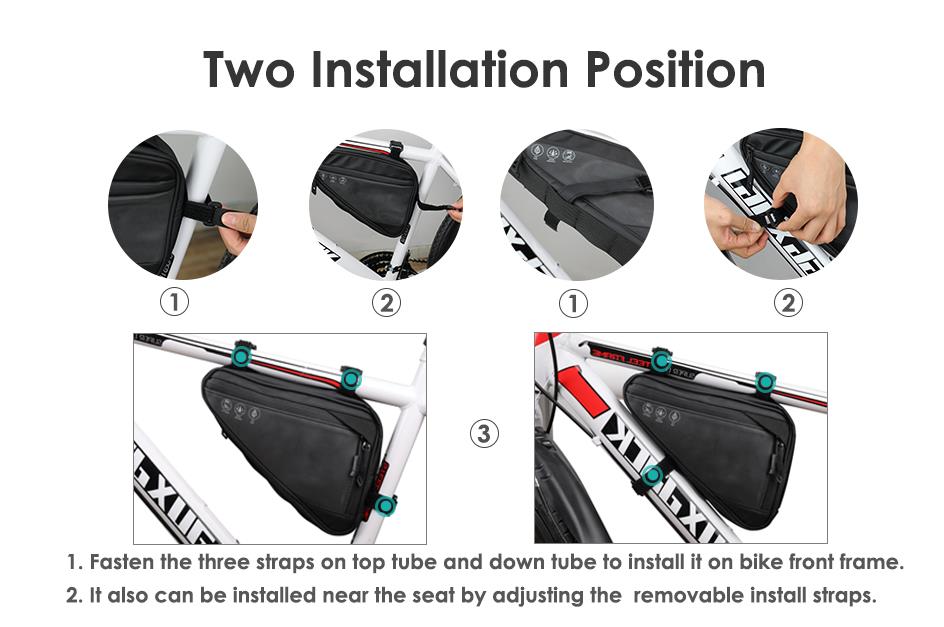 2. 스트랩온 & 조절 가능한 위치 설치 --- 가방 프레임 전체를 감싸는 독특한 디자인의 고리와 3개의 독립적인 후크 앤 루프 패스너 스트랩을 통해, 트라이앵글 백은 안장 아래나 핸들바 근처에 안전하고 견고하게 설치할 수 있어 물병 브래킷을 방해하지 않습니다. 다재다능한 설치 방식으로 대부분의 산악 자전거, 일반 자전거, 통근용 자전거에 적합합니다.