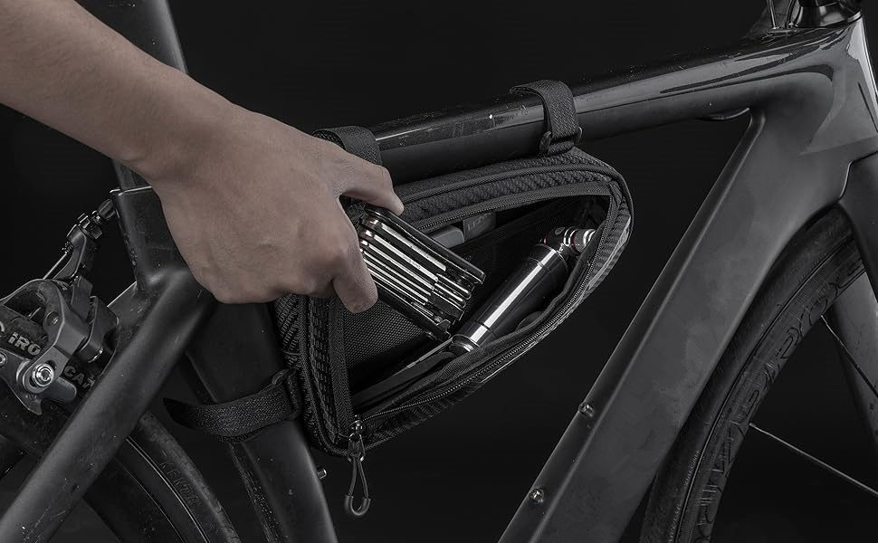 ★NEŠIOJAMAS TRIKAMPIS MAIŠELIS:Trikampio formos dviračio krepšys sveria tik 0,35 svaro, iš viso 1,2 l talpos kasdieniam naudojimui. Mūsų dizaineris išbandė daugybę šio krepšio dydžių standartų, kad užtikrintų didžiausią talpą ir geriausią pritaikomumą. Šis didelis ir patvarus dviračių laikymo krepšys skirtas plento, kalnų ir kasdieniams dviračiams.