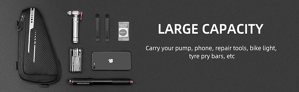 ★Didelė saugykla:Pakankamai didelė, kad tilptų visi įrankiai ir reikalingi daiktai, pakankamai maža, kad tilptų po dviračio rėmu. Erdvi kišenė telefonui, ausinėms ir pinigų segtukui, o kita didelė tinklinė kišenė skirta raktams, maistui ir kt.