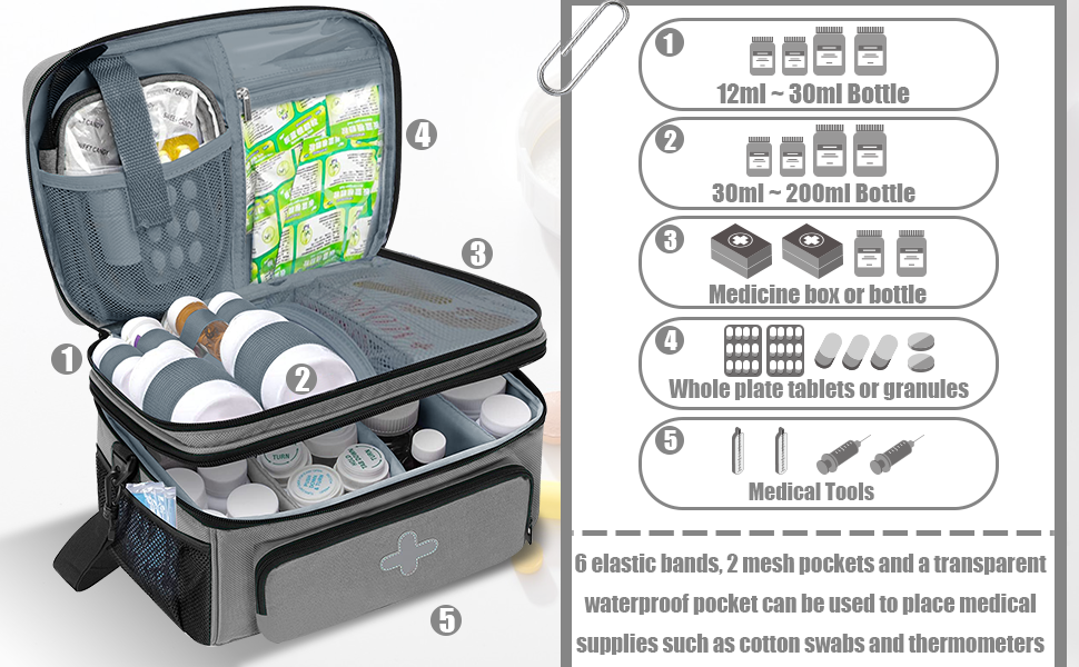【Various pockets】:the upper compartment has 6 elastic bands, 2 mesh pockets and a transparent waterproof pocket, the small elastic band can help you secure smaller medicine bottles without loosening, the large elastic band can hold 200ml medicine bottles, mesh pocket And transparent waterproof bag can be used to place medical supplies such as cotton swabs and thermometers
