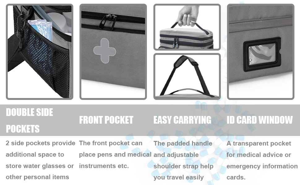 【Large storage space】:Our medicine bag has an upper and lower compartment design, which can accommodate 15-200ml pill bottles, etc., to meet your storage needs. The mesh pockets on both sides and the front compartment can place water cups, pens and medical instruments etc.