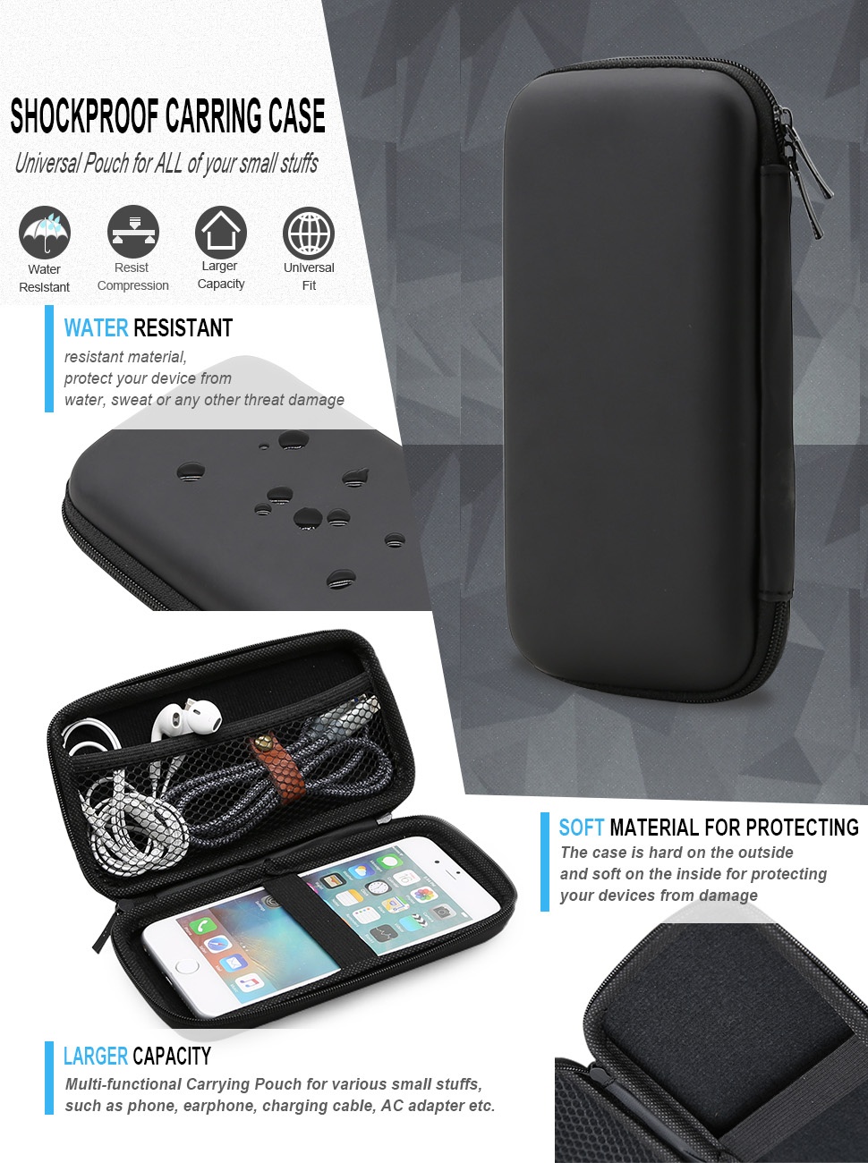 ◑Shockproof EVA Pouch: toerana fitahirizana ho an'ny finday, power bank, bateria raharaha, adaptatera, charger, USB tariby; Ny habeny dia mety amin'ny Anker PowerCore 10000mAh 13000mAh 20100mAh portable charger, ho an'ny Anker 622 magnetic wireless portable charger, ho an'ny Anker 325 Power Bank 521 batterie magnetika, ho an'ny Miady 10000mAh 5000mAh portable charger, ho an'ny INIU 10000mAh, 10500mAh Portable Charger kely 4500mAh, ho an'ny charger BONAI, ho an'ny banky herinaratra Yoobao, ho an'ny charger POWERADD EnergyCell Pilot