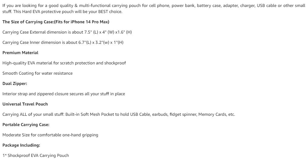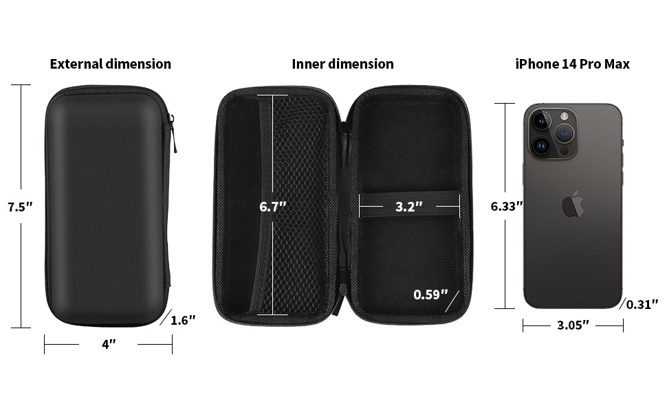 ◑ Carrying Case ivelany refy: 7.5'' (L) x 4" (W) x1.6" (H); refy anatiny: 6.5''(L) x 3.2''(w) x 1''(H); Ny kitapo fitsangatsanganana manafintohina dia azo ampifandraisina amin'ny iPhone 14 Pro Max roa, fa tsy mifanaraka amin'ny charger matevina kokoa noho ny 1.2 santimetatra toa ny Macbook Pro Charger.