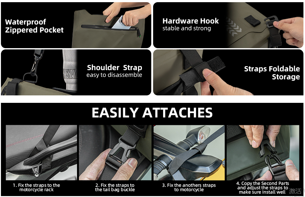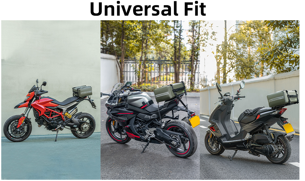- യൂണിവേഴ്സൽ ഫിറ്റ്: മോട്ടോർസൈക്കിൾ സീറ്റ് ബാഗിൽ മോട്ടോർസൈക്കിളിന്റെ പിൻഭാഗത്തെ കാരിയറിൽ ഘടിപ്പിക്കാൻ സ്ട്രാപ്പുകളുണ്ട്. മോട്ടോർസൈക്കിളിൽ എളുപ്പത്തിൽ ഘടിപ്പിക്കാം, ഒരിക്കൽ ഉറപ്പിച്ചുകഴിഞ്ഞാൽ അത് അനങ്ങില്ല! എല്ലാ ബക്കിളുകളും ഒന്നുകിൽ ലോഹമോ വളരെ കടുപ്പമുള്ള പ്ലാസ്റ്റിക്കോ ആണ്.