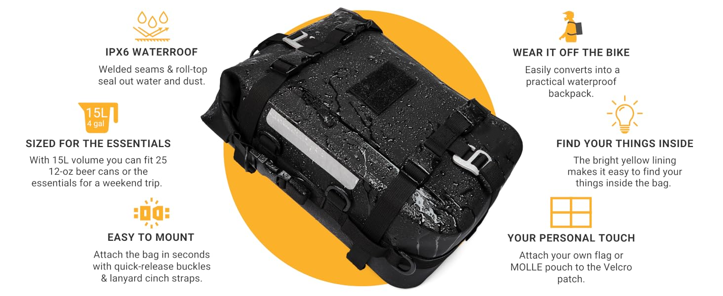 [15L ਵਾਧੂ ਸਮਰੱਥਾ] ਆਪਣੇ ਮੌਜੂਦਾ ਮੋਟਰਸਾਈਕਲ ਬੈਗਾਂ ਅਤੇ ਸਮਾਨ, ਟੈਂਕ ਬੈਗ, ਮੋਟਰਸਾਈਕਲ ਪੈਨੀਅਰ ਜਾਂ ਟਾਪ ਬਾਕਸ ਦੀ ਸਮਰੱਥਾ ਵਧਾਉਣ ਲਈ 15L ਵਾਟਰਪ੍ਰੂਫ਼ ਪਾਊਚ ਨੂੰ ਇੱਕ ਆਸਾਨ ਅਤੇ ਵਾਟਰਪ੍ਰੂਫ਼ ਸਟੋਰੇਜ ਹੱਲ ਵਜੋਂ ਵਰਤੋ।