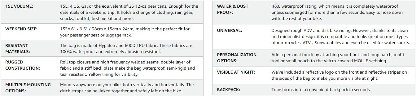 [ਸਮਰੱਥਾ ਅਤੇ ਮਾਪ] ਇਸ ਮੋਟਰਸਾਈਕਲ ਟ੍ਰੈਵਲ ਬੈਗ ਦੀ ਸਮਰੱਥਾ 15 ਲੀਟਰ ਹੈ। ਇੱਕ ਹਵਾਲੇ ਵਜੋਂ ਇਸ ਵਿੱਚ 25 12-ਔਂਸ ਬੀਅਰ ਕੈਨ ਹਨ। ਇਸਦਾ ਮਾਪ L:15", W:9.5", H:6" ਹੈ।