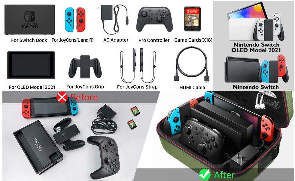 ��� SWITCH STORAGE CASE - This carrying case is specially designed for Nintendo Switch 2017 or Switch OLED Model 2021, as well as your Switch Dock, AC Charging Adapter, Joy-Con Grip, Joy-Con Straps, HDMI Cable, Switch Pro controller, also for Pokémon GO Plus + 2023, and up to 18 game cards Slots, along with other switch accessories.