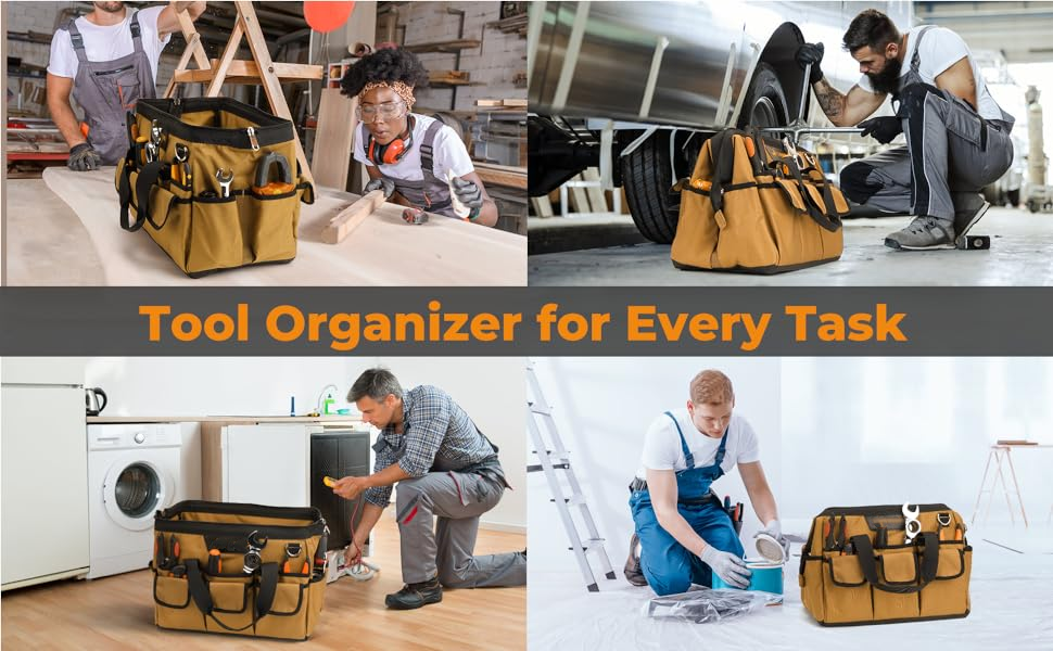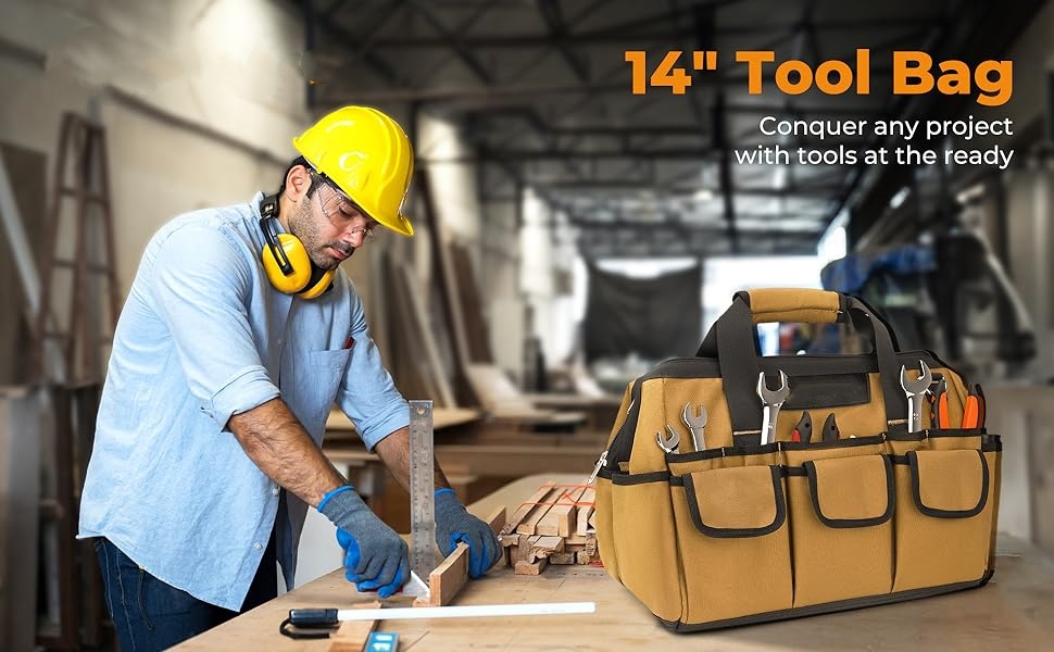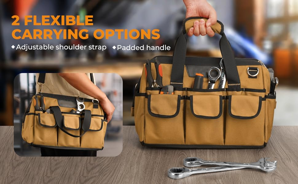 - Transporte sem esforço: Seja qual for a sua preferência, o conforto das alças acolchoadas ou a flexibilidade de uma alça de ombro ajustável com fivelas de metal reforçadas, esta bolsa para ferramentas oferece opções de transporte que se adaptam ao seu estilo e garantem a execução perfeita do trabalho.