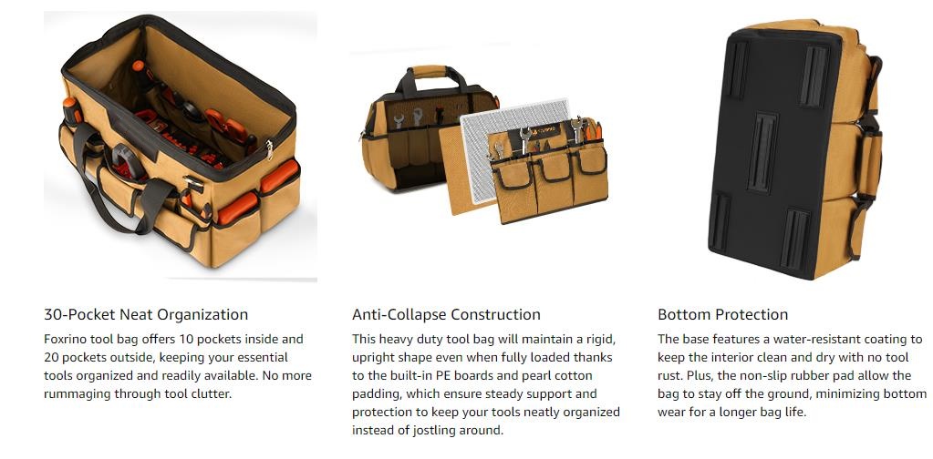 - Construção Anticolapso: Esta bolsa de ferramentas resistente manterá uma forma rígida e vertical mesmo quando totalmente carregada, graças às placas de PE integradas e ao acolchoamento de algodão perolado, que garantem suporte firme e proteção para manter suas ferramentas organizadas e seguras, em vez de soltas e balançando.