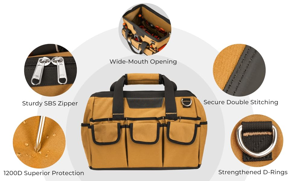 - Durabilidade incrível: Fabricada com tecido 1200D resistente e forro de PVC, esta bolsa para ferramentas oferece excelente resistência à água, perfurações e desgaste. Graças à costura dupla reforçada, a bolsa suporta com facilidade qualquer tarefa árdua que seu projeto exigir.