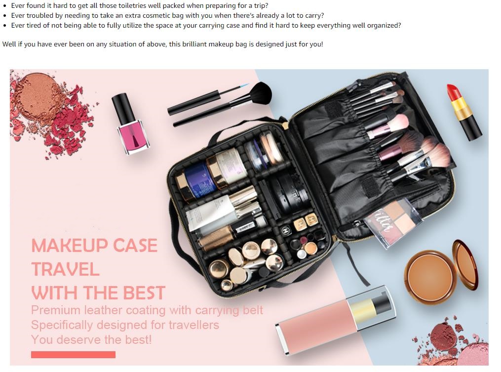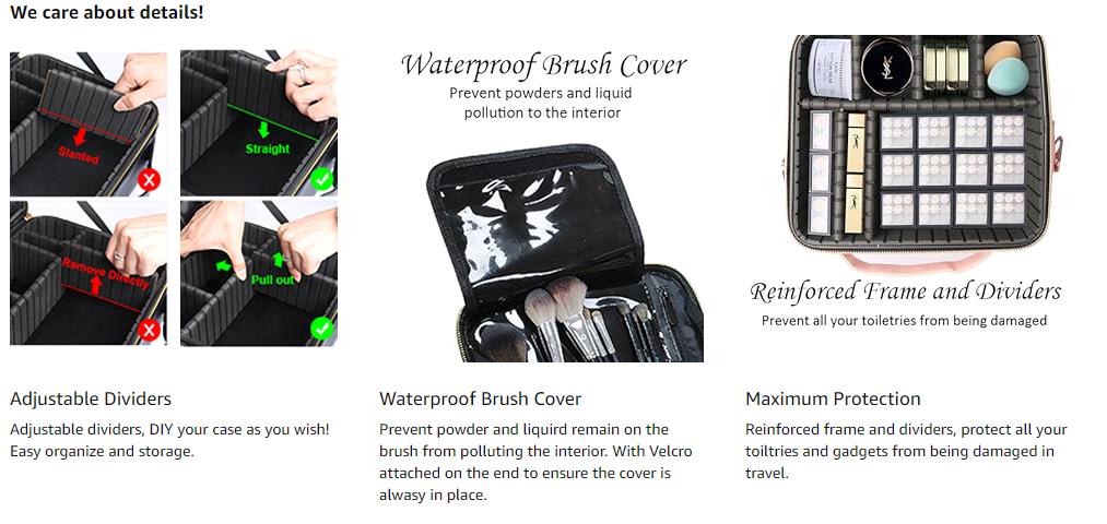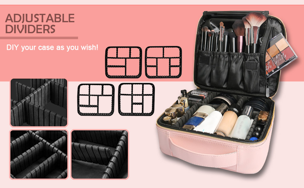 2.Unique and Exquisite Design⊙ Main compartment includes 6 adjustable sponge dividers, you could rearrange sponge dividers to fit your needs. Dual zippers closure provides quick loading and easy access. Simple but creative cosmetic makeup bag.