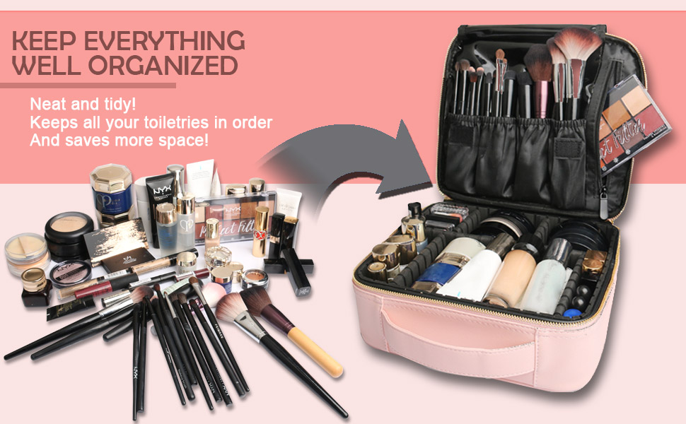 1.Fit All Your Need⊙ 10.2 x 9.8 x 3.8 inch,Provide ample space to Fit in women cosmetics makeup essentials like makeup brush, lipstick, eye shadow, skincare products, shampoo ,creams ,nail art products, jewelry, toiletry, hairbrushes, travel accessories.