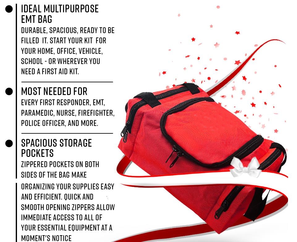 - IDEAL MULTIPURPOSE EMT BAG: Durable, spacious, and ready to be filled with any variety of tools and equipment that you might choose for your first aid kit. Start your kit with this large trauma bag when creating a first aid kit for your home, office, vehicle, school - or wherever you need a first aid kit. Organization and durability are required for every first responder, EMT, paramedic, nurse, firefighter, police officer, and more.