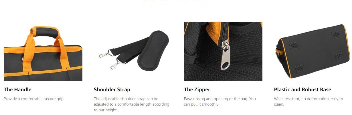 - 【Fausia Tumau】 Fausia mai le mamafa-tiute 600D Oxford Ie mea, ua fausia lenei taga meafaigaluega e tatalia le faigata o le faaaogaina i aso taitasi ma maua ai le tumau umi. O le faufale malosi e fa'amautinoa ai le puipuia ma le malupuipuia o au mea faigaluega, e o'o lava i si'osi'omaga faigata o galuega
