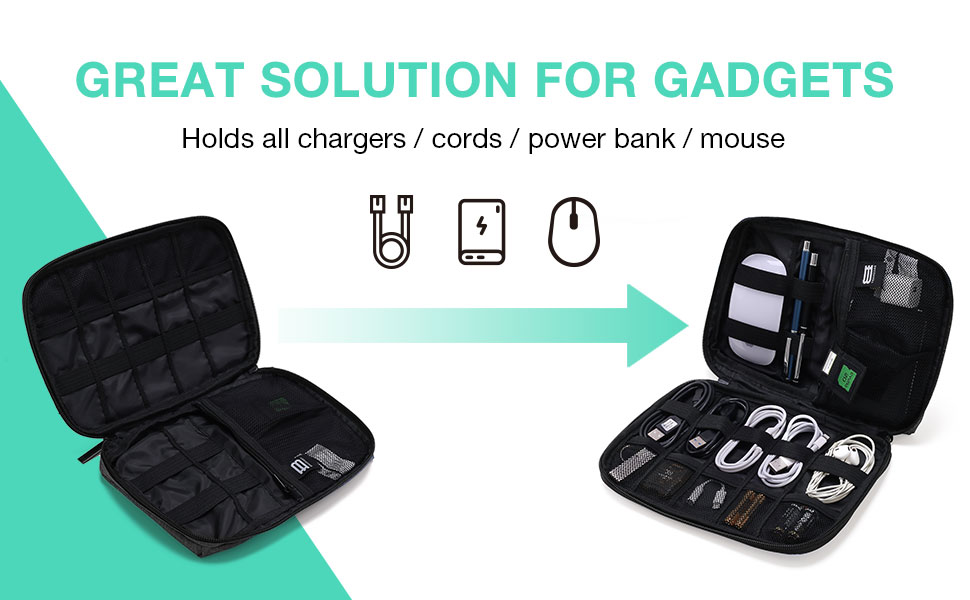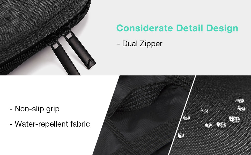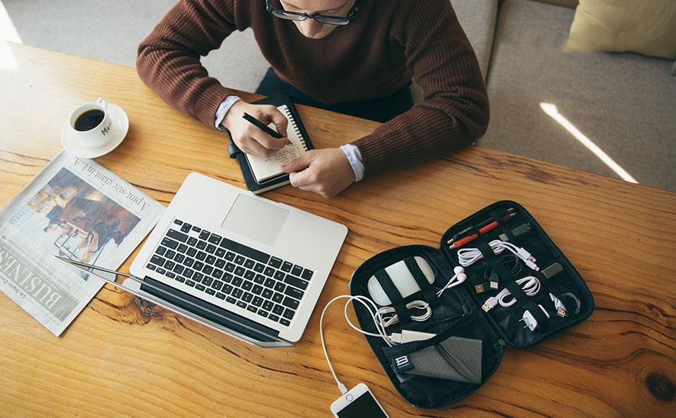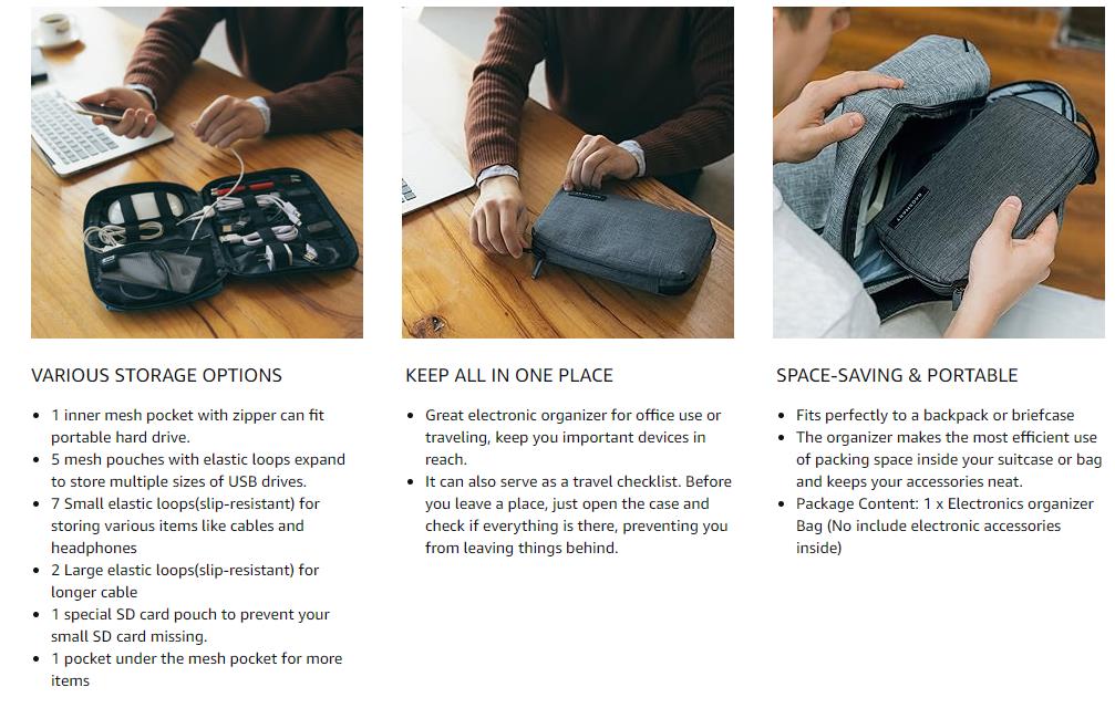 - Компактна величина: Торба за организатор електронике је димензија 23,4 цм Д x 16,7 цм Ш x 3,4 цм В и тежи 0,24 фунте, што је чини лаганом и просторно штедљивом опцијом за путовања.