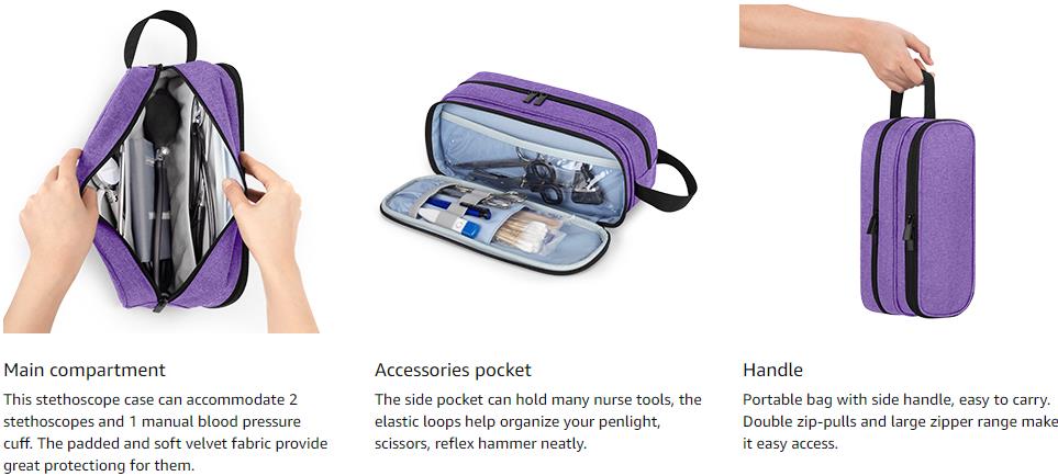 - GREAT PROTECTION: The main compartment consists of soft velvet fabric and thickened padded lining, which can effectively absorb impacts and reduce damages caused by bumps and drops, securely keep your two stethoscopes or BP cuffs.