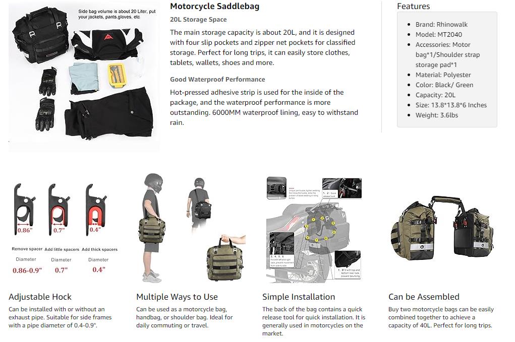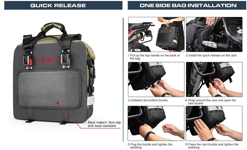- Simple Installation: The back of the bag contains a quick release tool for quick installation. It is generally used in motorcycles on the market, and can be installed with or without an exhaust pipe. Suitable for side frames with a pipe diameter of 10mm-22mm. Equipped with a strap, it can be used as a shoulder bag, which can be crossed or carried by hand.