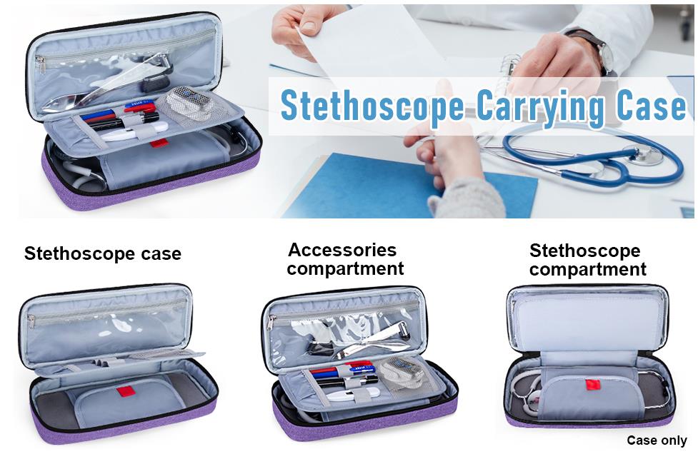 DIMENTIONS: Inside: 11”*4.7”*1.6”. This stethoscope travel bag is compatible with most stethoscope. Enough room for the stethoscope and other medical supplies, double zip-pulls makes it easy access.