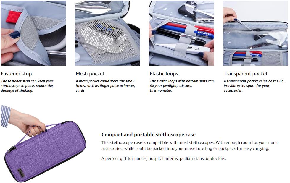 HIGH CAPACITY: Inner insert dividers this bag into two rooms, one for stethoscope, the other for nurse accessories. The elastic loops with bottom slots can fix your penlight, scissors, reflex hammer. The cover with fastener strip can keep your stethoscope in place.
