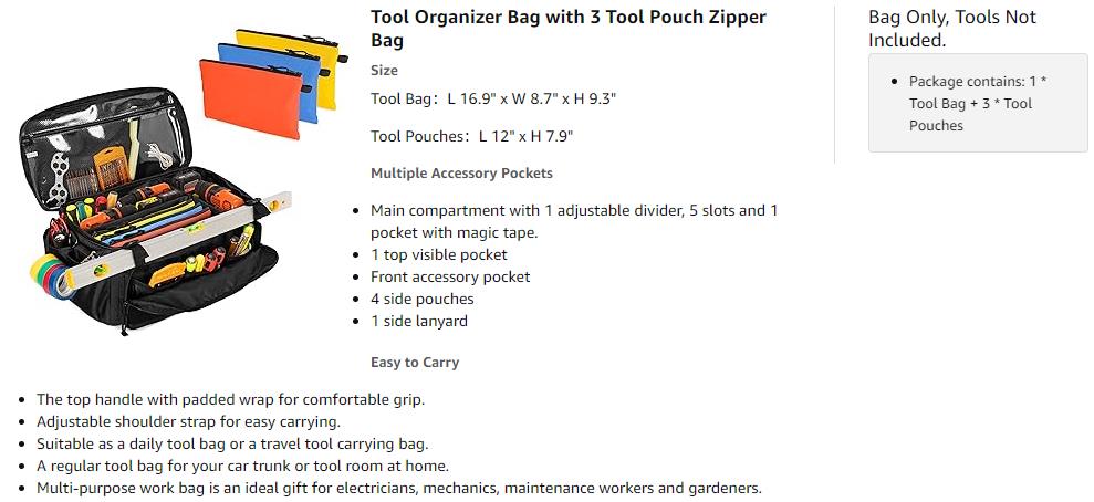 - PACKAGE CONTAINS - 1 tool organizer bag (L 16.9" x W 8.7" x H 9.3") and 3 tool pouch zipper bag (L 12" x H 7.9"). Tool tote bag made of sturdy nylon material, the bottom with thick padding and PU coated anti-slip fabric, which can reduce friction between the tool tote and the ground ensure long-term service. (Patented Design)