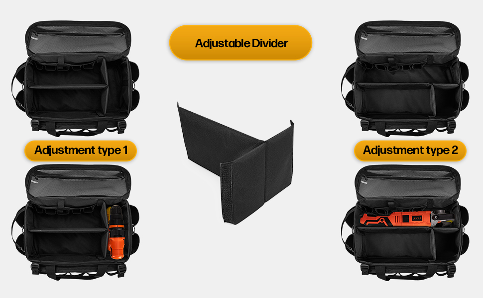 - WELL ORGANIZED - The main compartment with removable divider and multiple samll pouches suitable for long hand tools, electric screwdrives, wrenches, pliers, screwdrivers or other accessories. Top visible pocket for instructions, drawings, cable, etc.