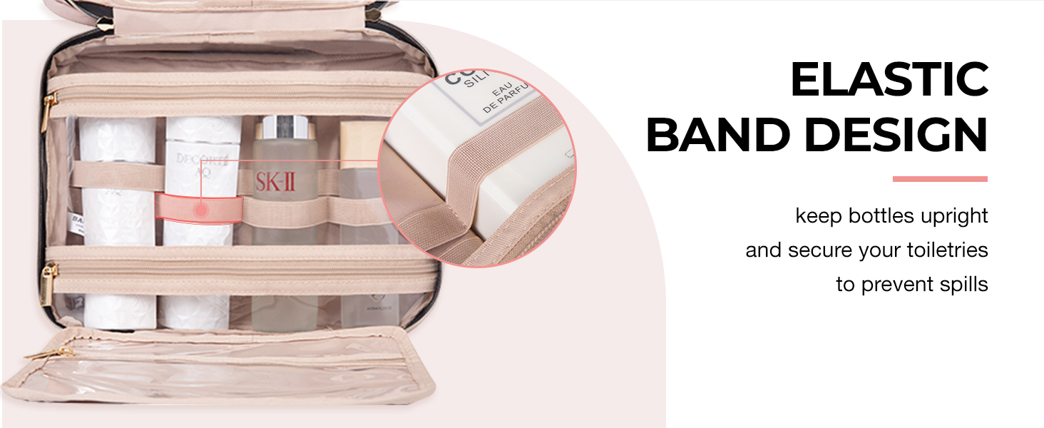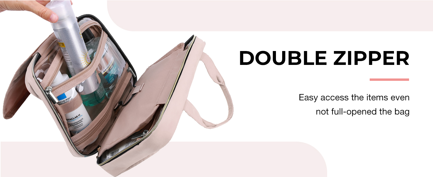 - Special Design - Inner main pockets with elastic straps hold bottles upright; Double zipper compartment for easy access the items even not full-opened the bag; Transparent sides for providing clear overview of contents.