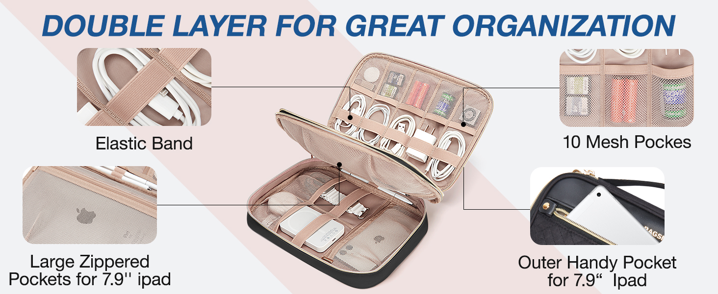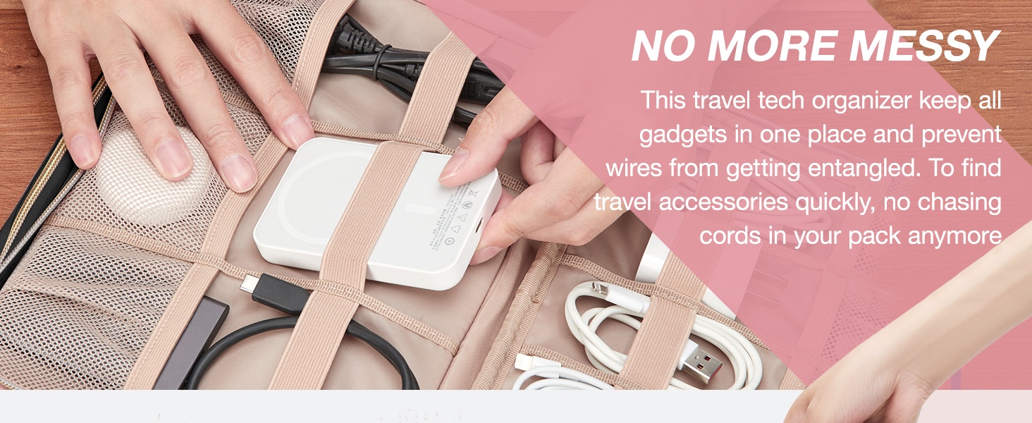 - Keep Everything Organized: This travel cord organizer comes with 2 large zippered pockets, 10 mesh pockets, 12 elastic loops, and 1 outer handy pocket to prevent wires from getting entangled. Different functional areas meet your different storage needs. Bid farewell to chaos and embrace a simpler, more streamlined life.