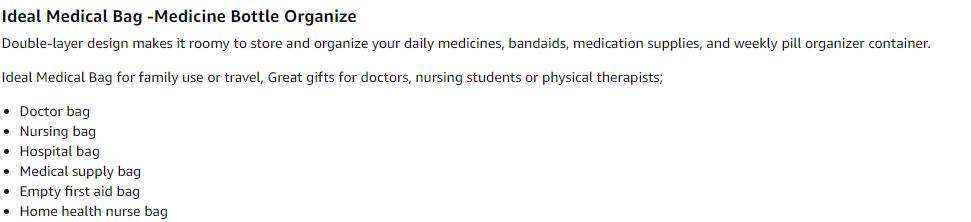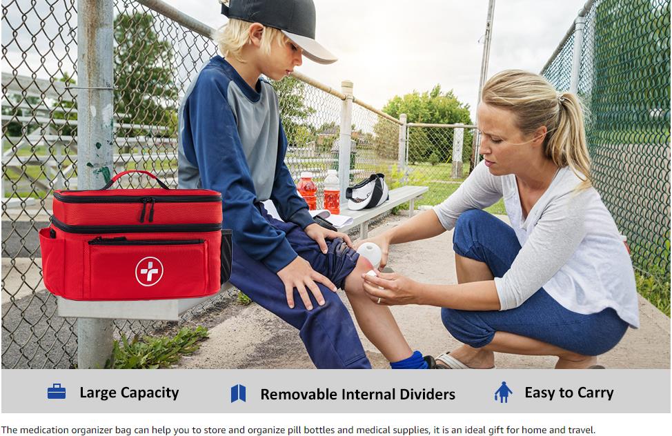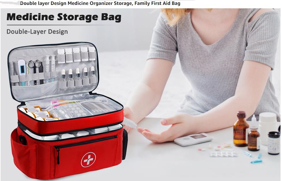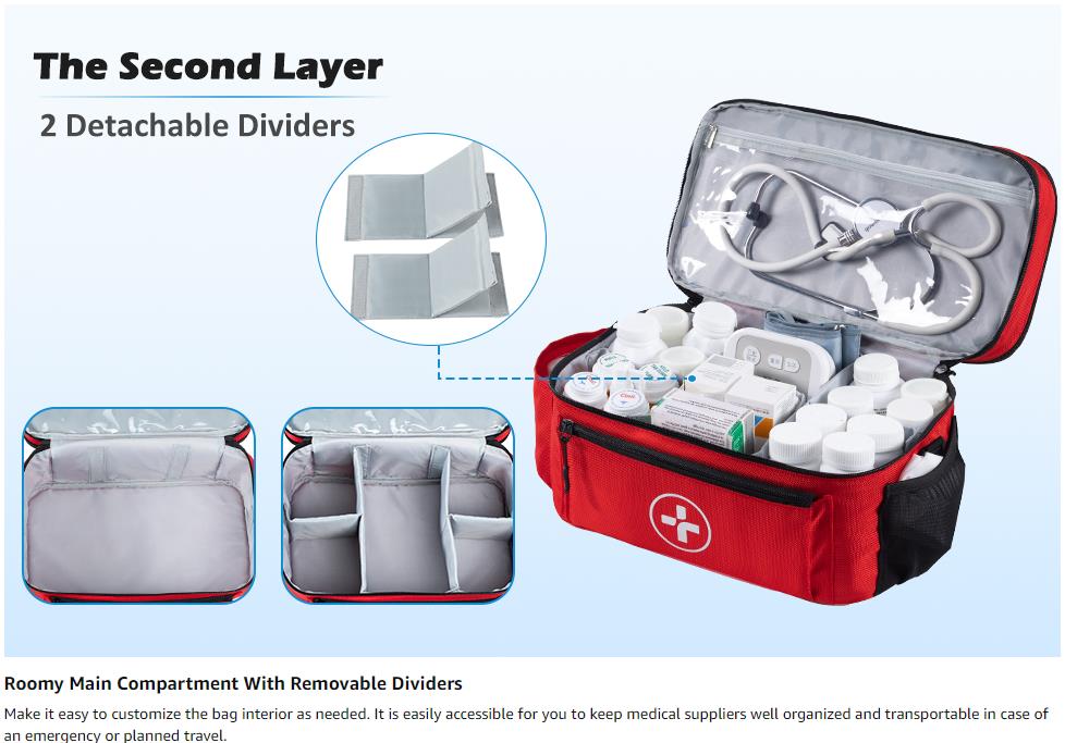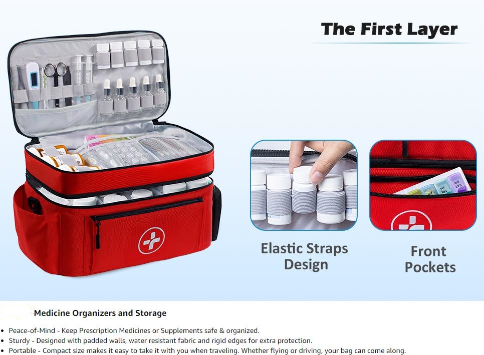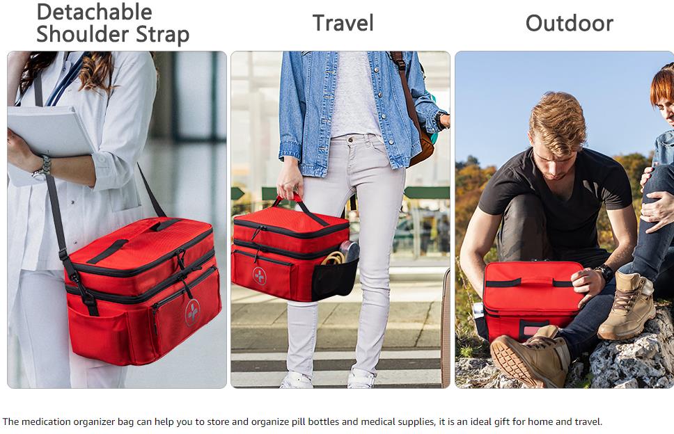 Double-Layer Design: The bag has a double-layer design that provides ample space to store and organize daily medicines, bandaids, medication supplies, and weekly pill organizer containers.