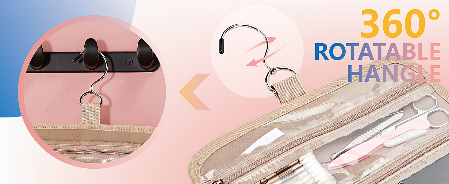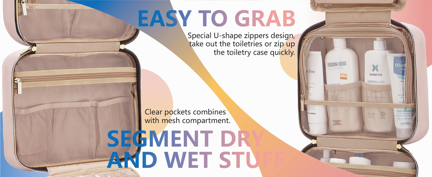 - STURDY HOOK DESIGN - Special U-shape zippers design, take out the toiletries or zip up the toiletry case quickly. No more unpacking, digging through one bag, and laying your stuff on the bathroom counter. Just hang the bag up, grab what you need, and put it back in it.